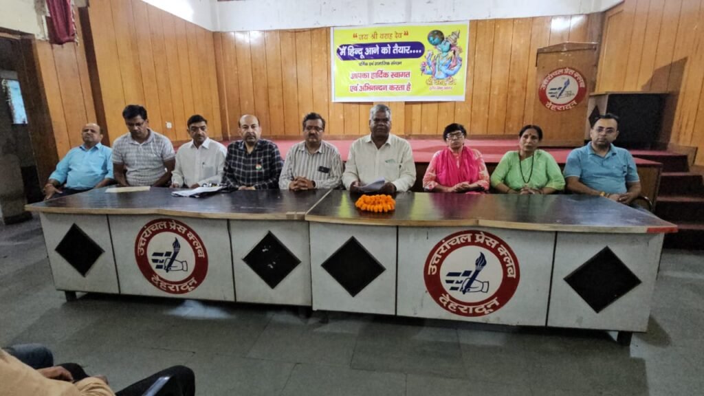 यहां उत्तरांचल प्रेस क्लब के सभागार में आयोजित पत्रकार वार्ता में नवगठित संगठन के पदाधिकारियों ने संगठन के विषय में जानकारी दी। नव गठित इस संगठन की पदाधिकारी समिति में शामिल पदाधिकारियों में विवेक अग्रवाल (अध्यक्ष), शशि कान्त सिंघल (सचिव), अमित गोयल (कोषाध्यक्ष), शिखर कुच्छल (संयोजक), राजेश सिंघल (वरिष्ठ उपाध्यक्ष), सतीश कंसल (सह संयोजक), सोनू गुप्ता (उपाध्यक्ष), कमल जौली (उपाध्यक्ष), अजय गर्ग (सह कोषाध्यक्ष) हैं। इसके अलावा कार्यकारिणी सदस्य में ब्रिजेश माथुर, दयानंद बंसल, मीना पंवार, प्रेम सेठी, विक्रांत सिंघल, अनिल कुमार त्यागी, रजत गर्ग, दीपक त्यागी, देवी दयाल रावत शामिल है। पत्रकार वार्ता में संगठन के पदाधिकारियों ने जानकारी देते हुए बताया कि इसी वर्ष संगठन द्वारा देहरादून के लगभग 50 विद्यालयों में सनातन धर्म ज्ञान प्रतियोगिता आयोजित की जाएगी, जिसमें तीन वर्ग होंगे कक्षा 3 से 5, कक्षा 6 से 8 एवं कक्षा 9 से 12। प्रत्येक वर्ग के प्रथम, द्वितीय एवं तृतीय स्थान प्राप्त करने वाले विद्यार्थियों को शील्ड एवं प्रशस्ति पत्र प्रदान किया जाएगा तथा अन्य सभी प्रतिभागियों को सांत्वना पुरस्कार एवं प्रशस्ति पत्र दिए जाएंगे। इसके उपरांत एक अंतर विद्यालय प्रतियोगिता भी आयोजित की जाएगी। यह सभी कार्यक्रम जनरल मर्चेंट एसोसिएशन द्वारा प्रायोजित होंगे। उन्होंने यह भी बताया कि संगठन की तीन प्रमुख अपीलें क्रमशः एनिमेटेड फिल्म नरसिंह को करमुक्त (टैक्स फ्री) किया जाए एवं इसे प्रत्येक विद्यालय में प्रदर्शित किया जाए। इसके अलावा कक्षा 10 से 12 की छात्राओं को मेहंदी लगाना सिखाया जाए और करवा चौथ, अहोई अष्टमी जैसे त्यौहारों पर संगठन पूरे देहरादून में मेहंदी कैंप आयोजित करेगा। हिन्दू समाज की महिला शक्तियों एवं वरिष्ठ जनों की सुरक्षा हेतु संगठन द्वारा सतत प्रयास किए जाएंगे। प्रेस वार्ता में संगठन के अध्यक्ष विवेक अग्रवाल, सचिव शशि कान्त सिंघल, कोषाध्यक्ष अमित गोयल, संयोजक शिखर कुच्छल, वरिष्ठ उपाध्यक्ष राजेश सिंघल, सह संयोजक सतीश कंसल, उपाध्यक्ष सोनू गुप्ता एवं कमल जौली, सह कोषाध्यक्ष अजय गर्ग, कार्यकारिणी सदस्यगण सहित जनरल मर्चेंट एसोसिएशन देहरादून के महामंत्री राजकुमार गोयल, संरक्षक सुधीर कुमार जैन, मंत्री धन प्रकाश गोयल, मोहनलाल विरमानी, ज्ञान प्रकाश, सुरेन्द्र गोयल आदि उपस्थित रहे।