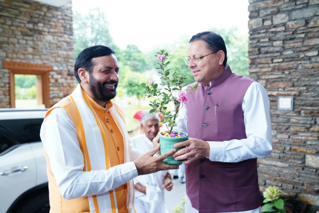 देहरादून। मुख्यमंत्री पुष्कर सिंह धामी ने रविवार को मुख्यमंत्री आवास में हरियाणा के मुख्यमंत्री नायब सिंह सैनी का स्वागत एवं अभिनंदन किया। इस अवसर पर मुख्यमंत्री पुष्कर सिंह धामी ने उन्हें चारधाम का प्रसाद एवं देवभूमि उत्तराखंड के अंब्रेला ब्रांड “हाउस ऑफ हिमालया“ के स्थानीय उत्पाद भी भेंट किए। मुख्यमंत्री पुष्कर सिंह धामी तथा हरियाणा के मुख्यमंत्री के मध्य दोनों राज्यों के हितों से संबंधित विभिन्न समसामयिक विषयों पर चर्चा हुई।