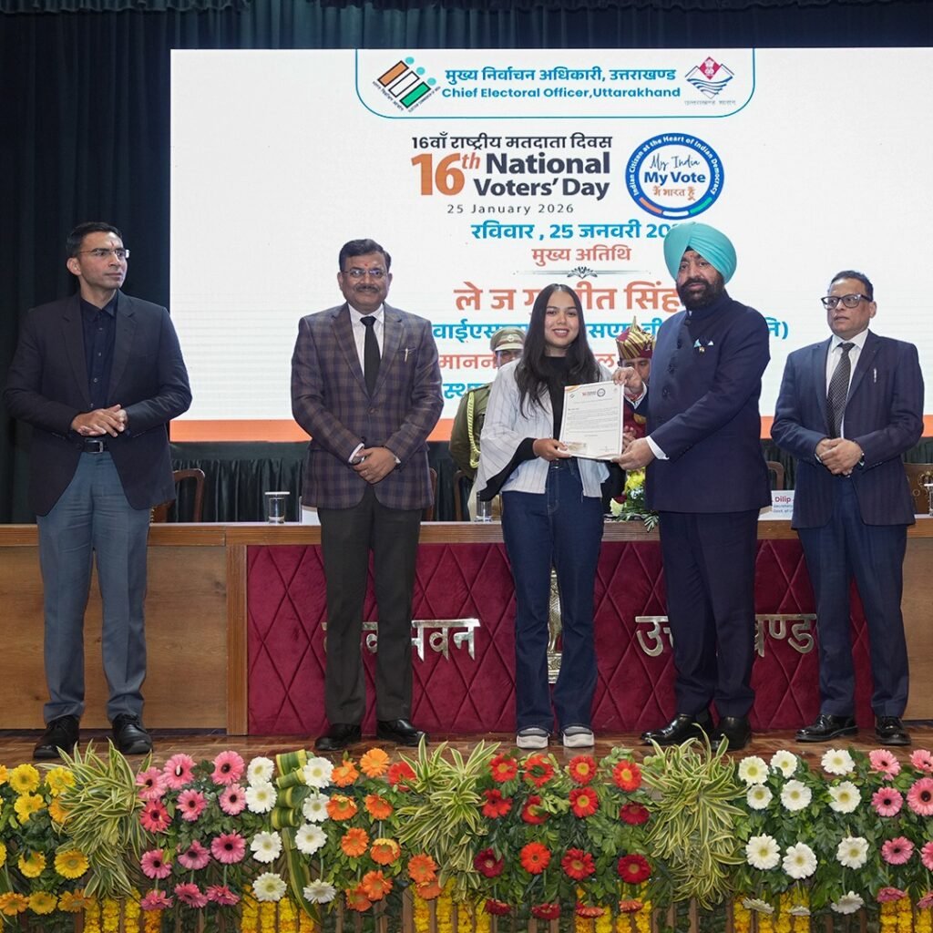 देहरादून। 16वें राष्ट्रीय मतदाता दिवस के अवसर पर रविवार को लोक भवन देहरादून में राज्य स्तरीय राष्ट्रीय मतदाता दिवस कार्यक्रम का आयोजन किया गया। कार्यक्रम में राज्यपाल लेफ्टिनेंट जनरल गुरमीत सिंह (से नि) ने बतौर मुख्य अतिथि प्रतिभाग किया। इस अवसर पर मंच पर मुख्य सचिव आनंद बर्द्धन, सचिव निर्वाचन दिलीप जावलकर, अपर मुख्य निर्वाचन अधिकारी डॉ. विजय कुमार जोगदंडे एवं जिलाधिकारी देहरादून सविन बंसल उपस्थित रहे। राज्यपाल लेफ्टिनेंट जनरल गुरमीत सिंह (से नि) ने 16वें राष्ट्रीय मतदाता दिवस के अवसर पर दीप प्रज्वलित कर कार्यक्रम का शुभारम्भ किया। इस दौरान राज्यपाल ने कार्यक्रम में उपस्थित नागरिकों को मतदाता शपथ भी दिलाई। राज्यपाल ने निर्वाचन गतिविधियों में उत्कृष्ट कार्य करने वाले जनपद रुद्रप्रयाग, उत्तरकाशी, चम्पावत और बागेश्वर के जिलाधिकारियों को सम्मानित किया। इसके साथ ही ईआरओ रुड़की, खटीमा और चकराता को प्री-एसआईआर के दौरान उत्कृष्ट कार्य हेतु सम्मानित किया गया। कार्यक्रम के दौरान राज्यपाल ने स्टेट आईकॉन पद्मश्री बसंती बिष्ट, ओलपिंयन मनीष रावत एवं नुंग्शी मलिक को स्मृति चिन्ह देकर सम्मानित किया। इस अवसर पर देहरादून जनपद के 18 वर्ष आयु पूर्ण कर चुके नए मतदाताओं को मतदाता पत्र देकर राज्यपाल ने सम्मानित किया।